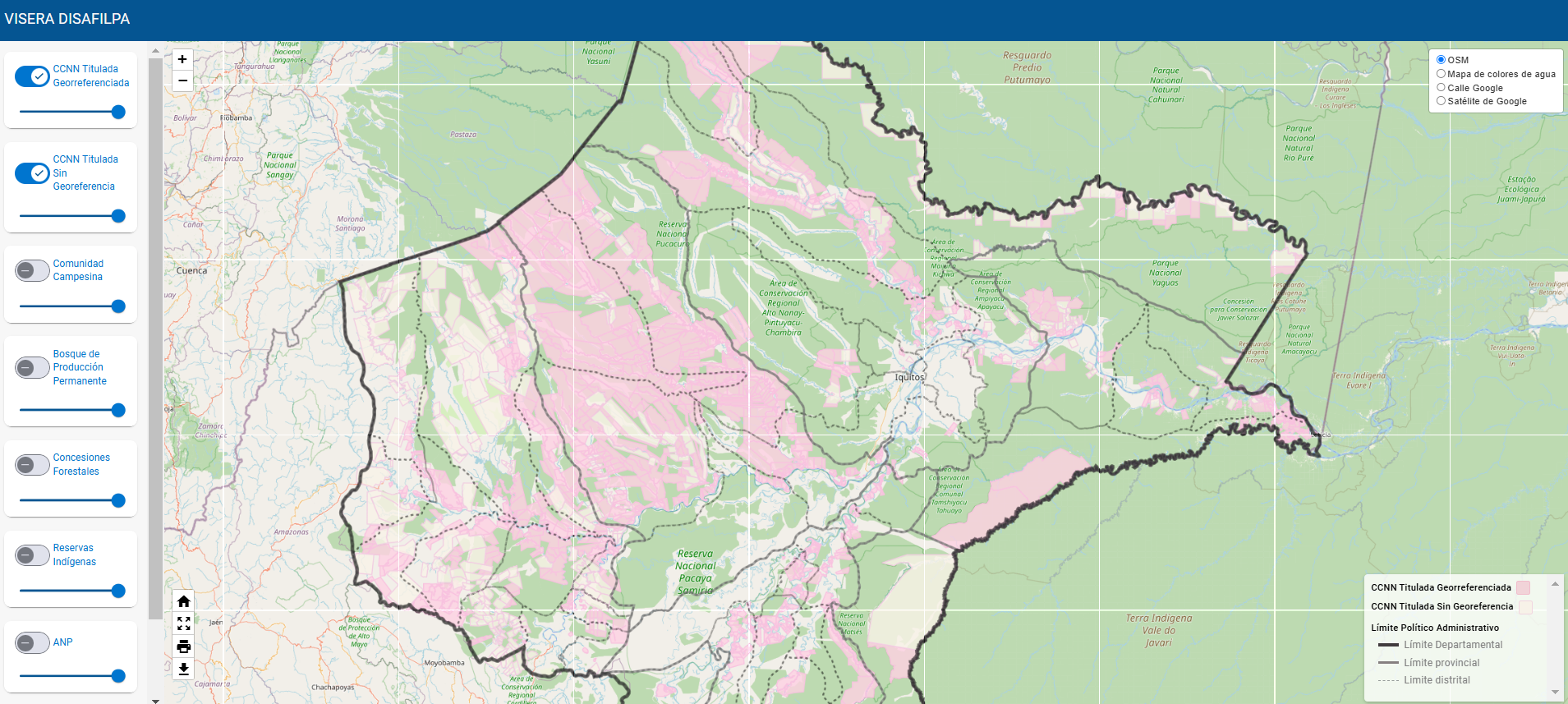 Vista de Visor de mapas, herramienta que permite ubicar en el mapa de Loreto las comunidades nativas y conocer si están superpuestas a otros territorios.