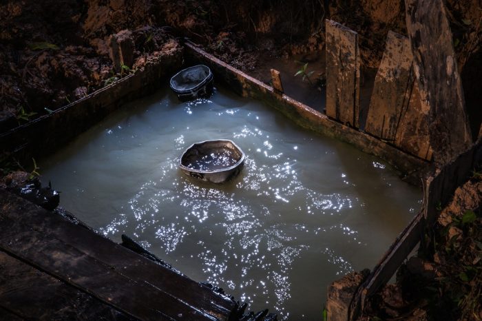 - En las comunidades de Yurúa no hay agua potable. En el caso de la CN San Pablo, todos obtienen agua directamente del río o de pozos como este. En estos agujeros cavados en el suelo arcilloso, la gente recoge agua para cocinar, se baña, lava su ropa y también la bebe directamente.