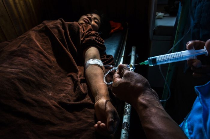 - Los doctores Edwin Paolo Anca y Hernando Pari tratan a una víctima de mordedura de víbora, el afectado estaba cortando hojas de yarina luego de cazar un venado cuando una serpiente loro machaco lo atacó. Para su suerte, la Municipalidad adquirió 7 sueros antiofídicos polivalentes, suficientes para tratar la mordedura en este caso, ya que una evacuación por aire hubiera resultado bastante complicada de noche.