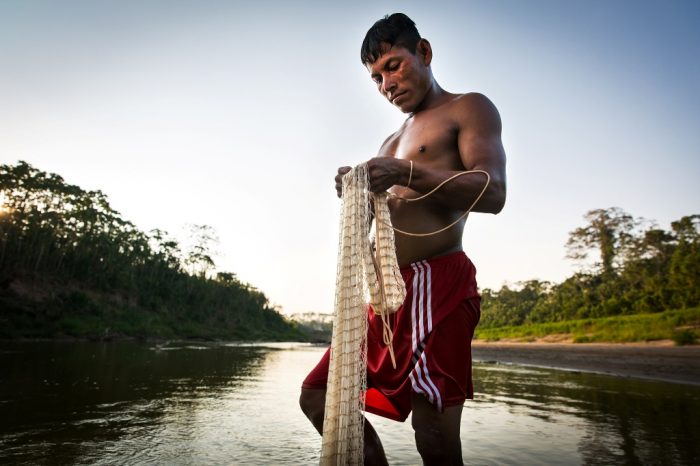 - Hilbert Ruiz Gómez, asheninka de la CN Dulce Gloria pesca con la tarrafa. «Todos los días se pesca, en nuestra casa nunca falta el pescado». El río Yurúa es conocido por la cantidad de peces que produce, al punto que no es difícil encontrar grandes bagres como zúngaros y saltones que superan los 100 kilos.