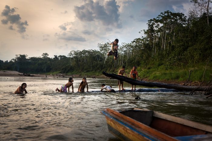 - Dos niños de la etnia amahuaca juegan en el río. En esta época del año sus aguas son tan bajas que casi no se pueden navegar, pero son ideales para nadar, algo que estos muchachos dominan a la perfección desde chiquitos.